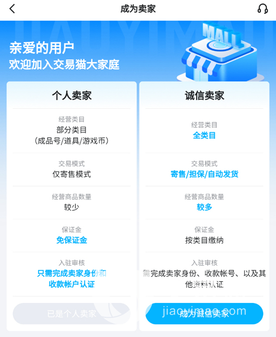 想要在市场中出售自己的账号,是需要获取卖家的资格认证,一般的平台都会要求大家缴纳保证金,但是这种方式对于散户来说不是很友好,因为我们也许只会出售少量的账号商品,这样的话很有可能连本都回不了。在交易猫中,有一种叫做个人卖家的认证,这种认证只需要绑定支付宝就可以获取,而且不需要缴纳任何的费用。虽然对上架的商品数量有限制,但是对于我们来说应该是够用了。