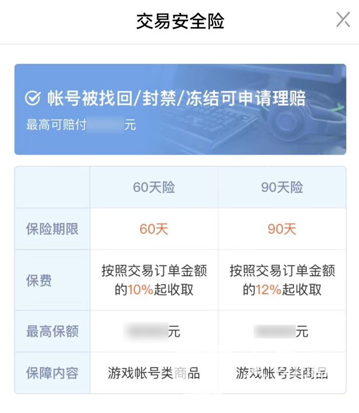 其实不至于此,在交易猫中还能够看到一些被投保的商品,购买了保险之后,在一定期限内如果账号出现了问题,都是可以请求索赔的。大家可以看到这个保险是需要收取保费的,不过保费是卖家店铺承担,所以也不需要大家有顾虑。但这个保险是有期限的,所以大家在选购的时候也要擦亮双眼看清楚,到底有没有投保,投保的期限是多久。