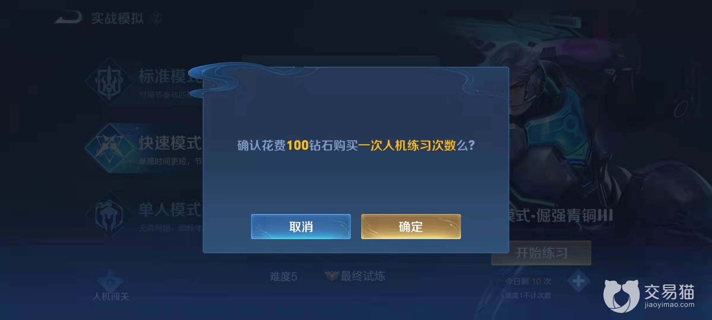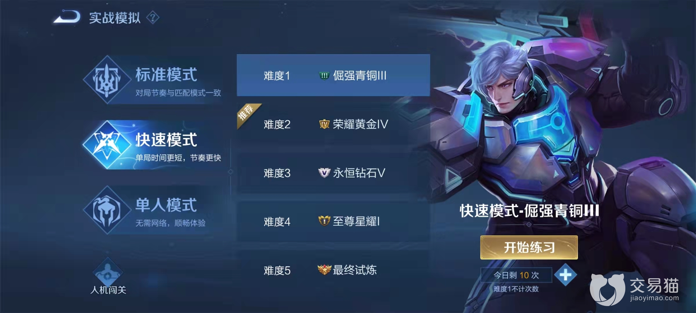 快速赛目前只支持5v5的王者峡谷,点进去后点人机然后就可找到一个叫“快速模式”的选项,它本质上属于PVE类型的玩法,由五个玩家对阵五个电脑,难度的话可以自行调配,最高可达到王者水平。