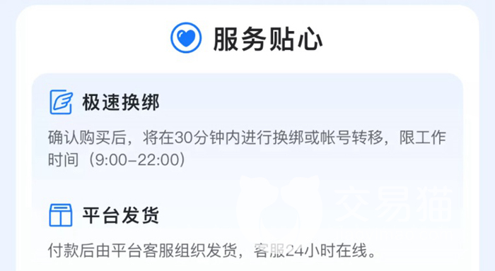 那么如果真的要在这款软件中进行交易,安全可以得到保障吗?答案是可以的。举个例子,在购买账号之后需要换绑大家都知道,一般来说都是要等到我们拿取到账号,然后下载对应的游戏,在游戏中或者是在官网进行换绑的工作。但是在交易猫中,还可以通过平台的极速换绑功能来实现,配合上平台发货,给我们带来很大的安全保障。