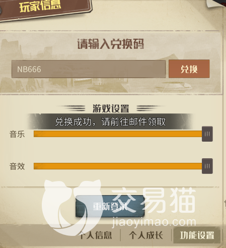 在功能设置选项下方有游戏音效的设置,上方就是兑换码输入界面了,玩家将获取到的兑换码输入进去,点击兑换,只要没有出错,系统就会将玩家得到的奖励发送到邮件当中,玩家回到邮箱领取获取到的奖励就可以了。