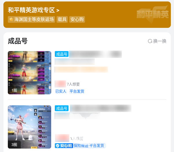 大家进入到软件中,在上方就能够看到和平精英的游戏专区了,这个地方会根据当前版本的热门内容而向大家推荐一些账号商品,其中带有一些限定的、返场的装扮物品。在这里看到的商品都是具有一定人气的,可以通过上方的换一换来发现更多的商品,或者直接进入专区中,还能够通过搜素或者是筛选来快速找到自己想要的某款皮肤或者是时装效果。这个平台中的账号商品还是有非常多的,这也代表了市场的人气很高,有不少稳定的用户。