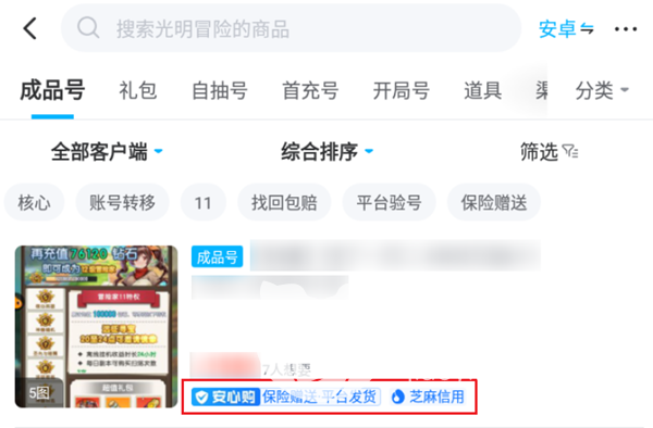 大家下载交易猫并且点击进入,搜索光明冒险这款游戏就可以进入到对应的专区中,在这里就有数不胜数的账号供大家选择,眼尖的小伙伴们会发现,这些账号下方都会带有不同的标签,比如安心购、平台发货、芝麻信用等。其实这些就是代表了该账号支持的一些平台安全服务,一般来说,支持的服务越多,这个账号的安全保障就会越多。