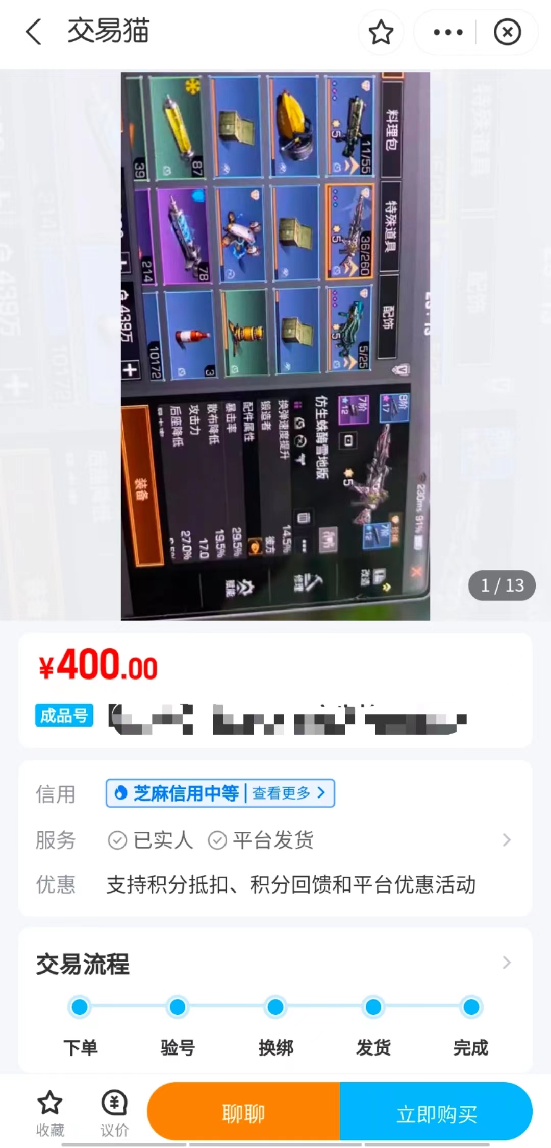 如果对哪个账号感兴趣,点进去以后还可以看到账号的详细信息,包括商品类型、客户端、角色等级等,如果玩家还有任何疑问,还可以使用平台的“聊聊”服务,一对一进行疑问,平台会即使帮助玩家进行答疑。