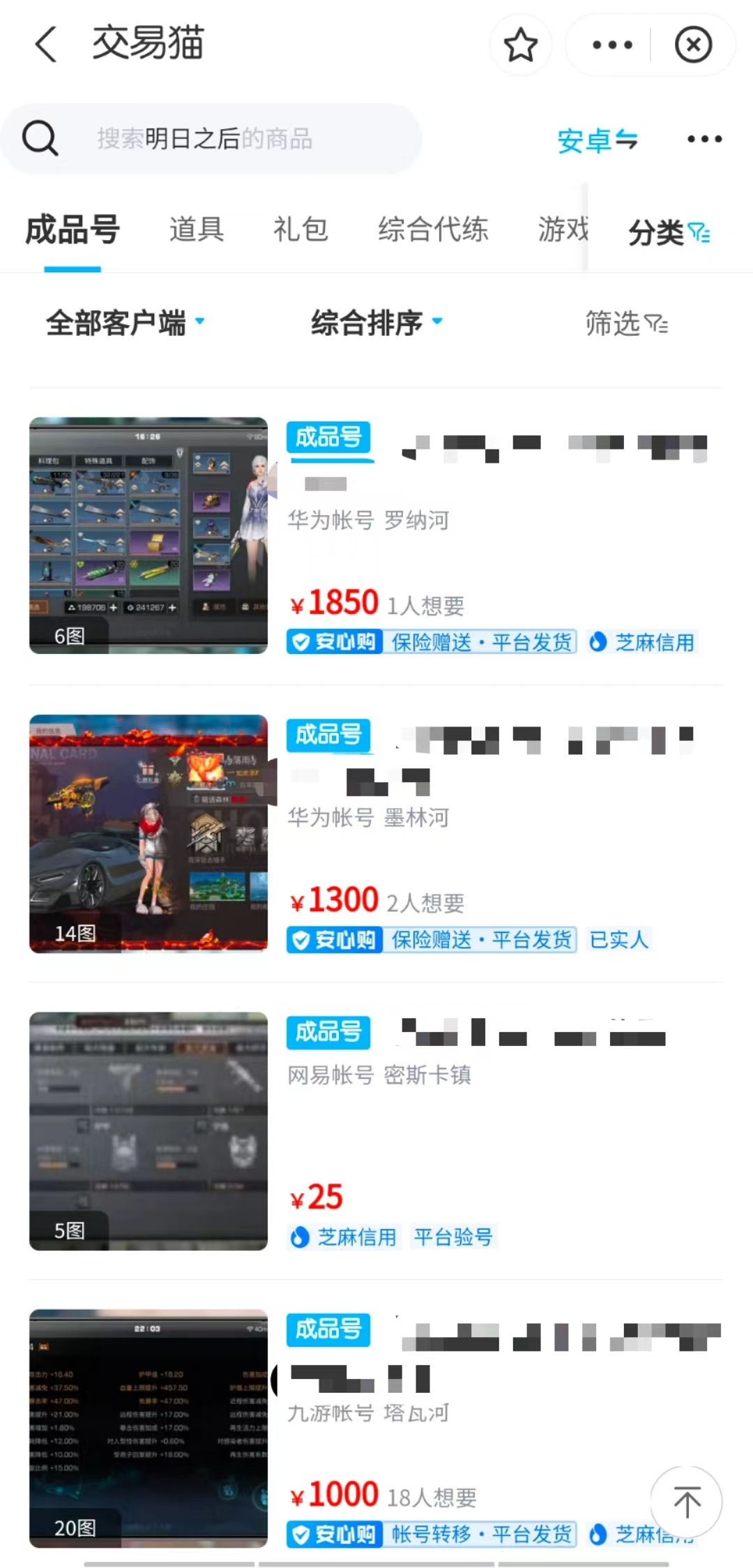 很多小伙伴喜欢玩明日之后,就是非常享受这款游戏带来的刺激感和成就感,不过在这个游戏里,需要花费大量的时间去收集物资、服装道具等;一些小伙伴觉得前期养号太费时间,想要直接体验一把游戏的快乐,那就可以考虑买一个高级的成品号来满足自己的要求。小编推荐大家去看一看交易猫,只要搜索“明日之后”就可以找到你想要的的账号了。