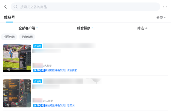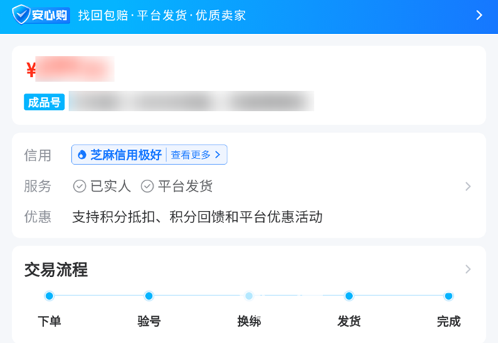 如果大家点击任意一个账号商品,除了其自带的一些内容,比如战斗力呀、包含的角色职业呀、拥有的装备皮肤呀,还会有一些对商品以及店家本身的附加服务介绍。比如其是否支持平台的安心购服务,是否带有平台发货功能,交易流程是怎么样的,卖家的信用如何,是否经过了实人认证。这些都是能够一目了然看到的。大家不要觉得这些信息不重要,因为线上的电子货品交易,有很多需要注意的安全隐患,而且相对而言水更深,那么通过这些信息,我们就能够很轻松地找到一些看起来靠谱的卖家。而且平台对于安全的机制保障工作也是十分到位的。