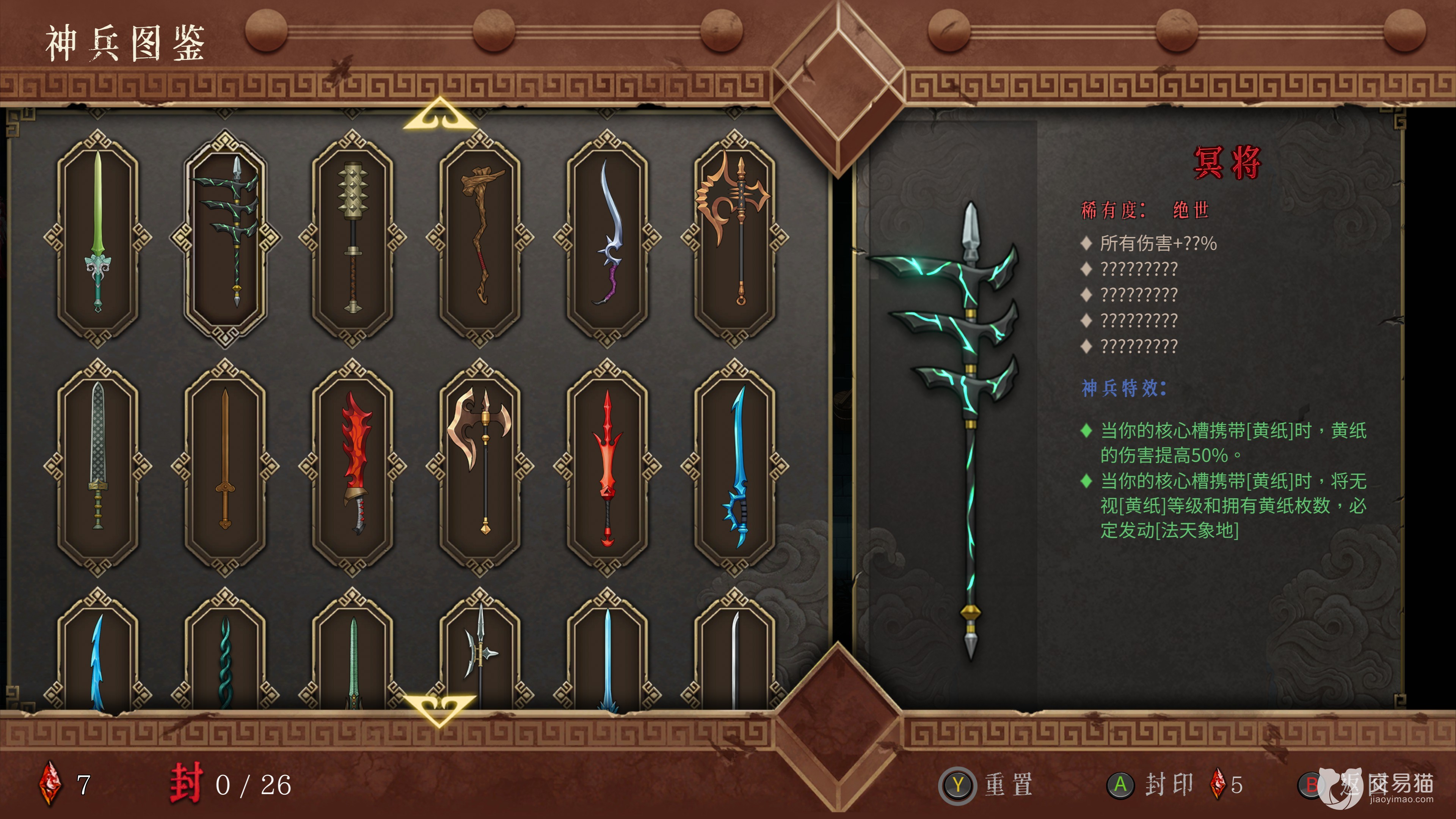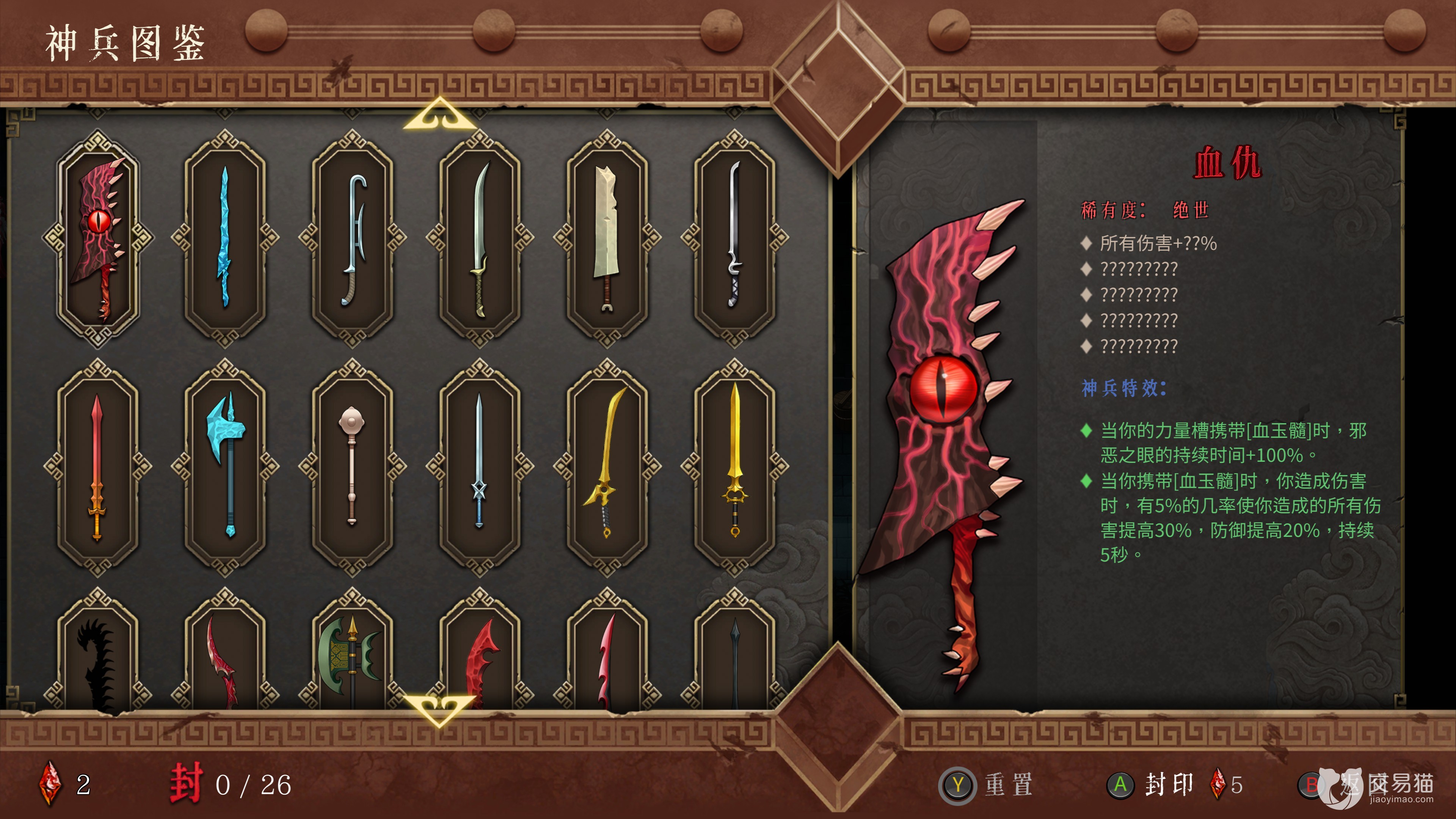 依靠圣物发生效果的武器,这里主要看它的神兵特效,比较典型的就是【血仇】这把武器全身红色长了一个大眼珠子,在击败第一章的boss之后可以解锁【血玉髓】圣物可以像第一关的boss一样发射血柱,也可以放在力量位置提升普攻,在你携带了这件物品的时候就会触发特效邪恶之眼,还能提高所有的伤害,如果是玩近战的可以在铁匠那里刷出相应的词条。还有很多的例如【狼王】、【冥妆】等武器都是根据圣物的效果发力,在有相应圣物之后这些武器会变得异常的强大。