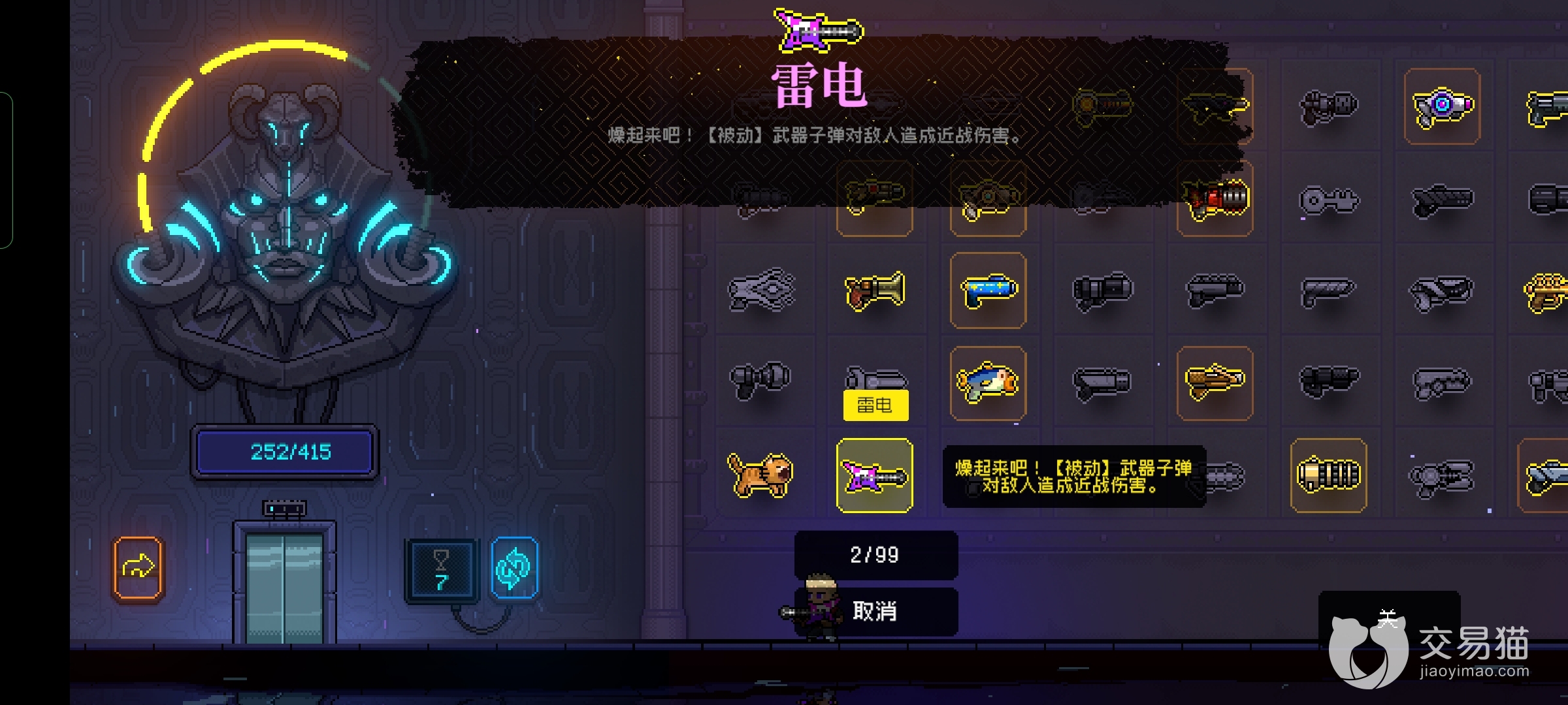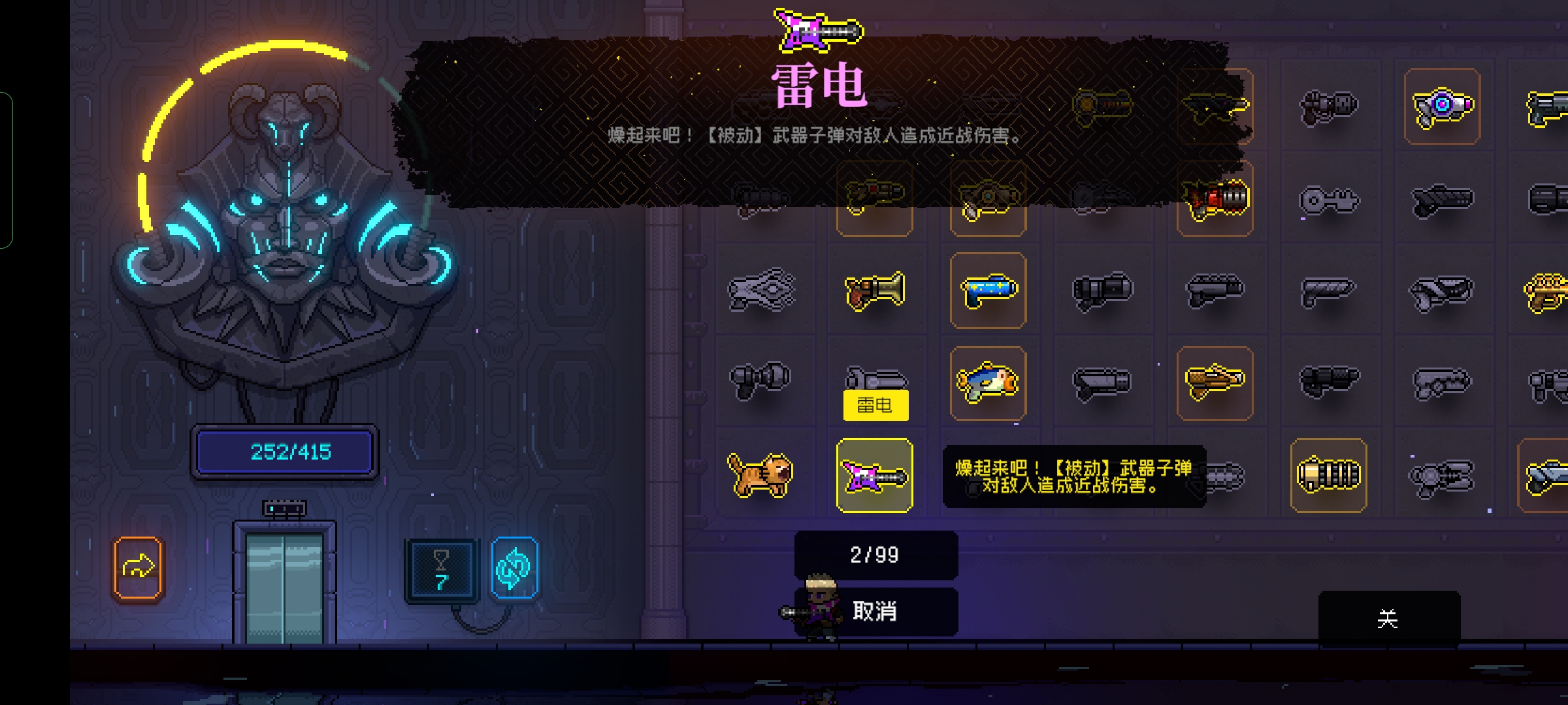 雷电也就是一把电音吉他是很多玩家的首选武器,这把武器攻击很特别,你在发动攻击的时候会释放音符子弹但是这个子弹不会攻击敌人而是会不断的环绕在玩家的身边形成一个顺时针旋转的弹幕,在玩家跳跃的时候会变大向四周造成伤害但是它的伤害适合玩家用小刀造成的伤害是一样的所以面对很多的boss都是游刃有余,这也是这把武器深受玩家喜爱的原因。除此之外另一把武器就是老猎人手感最好,这把武器也叫电锯发射器,可以放出电锯来回攻击敌人,放大子弹和分裂子弹的效果这个武器也能吃到,在面对版本的新boss的时候这把武器的表现也是所有武器当中比较强势的一把。