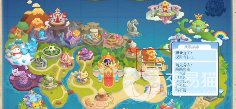 1、打开游戏地图,在里面找到跳跳集市,直接点击去即可。如上图所示。