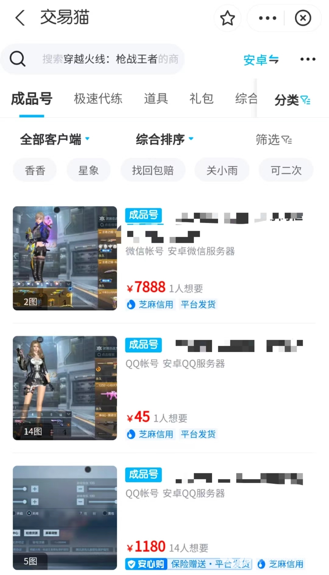 在交易猫内搜索相对应的游戏名称,就会出现上百条商品信息,玩家可以多维度了解这些账号的详细信息;因为商品量巨多,买家不用担心自己会买贵的问题,你可以进行货比三家,每个商品标出的价格就代表你目前想要购买账号的行情,这样有利于买家购买到更高性价比的账号。