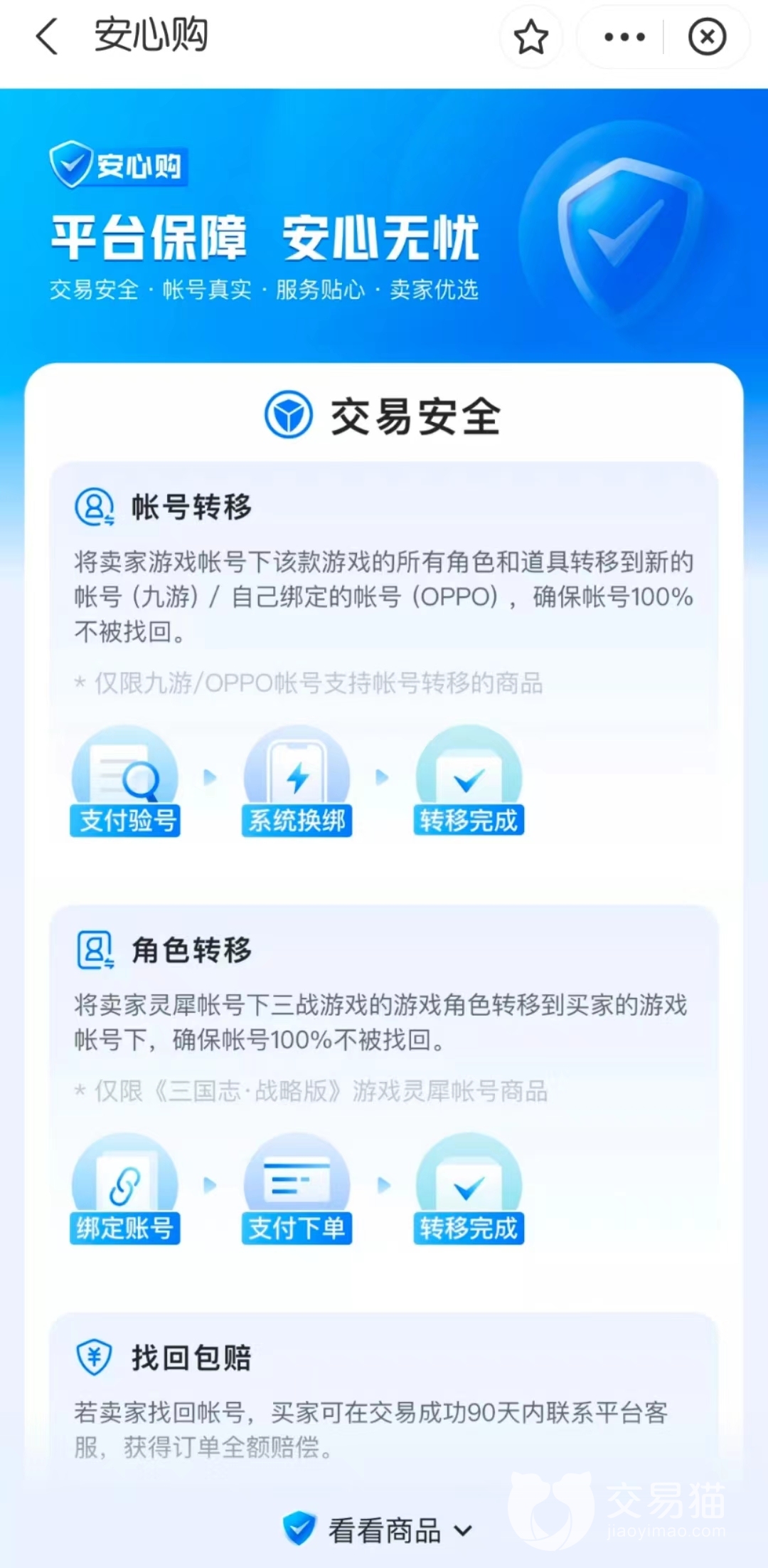 万一出现卖家通过一些手段找回了账号,买家也不用焦虑,这个时候你只要及时联系交易猫,平台是有“找回包赔”这项服务的,保证会对买家的损失进行赔偿。