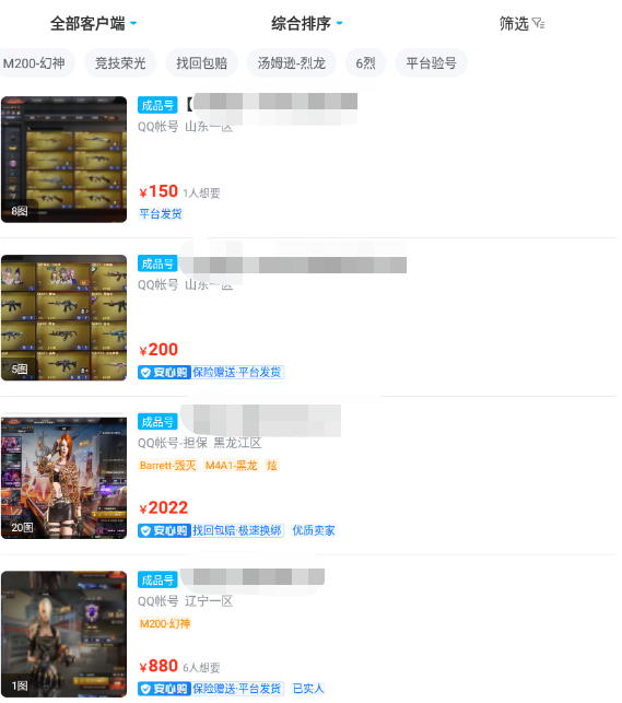 一、交易猫平台账号类型多样。购买穿越火线账号之前,玩家要有对账号的大概预想,想买角色还是游戏道具还是限定武器,到交易猫平台上面选择筛选功能,可以看到多种M200幻神、汤姆逊烈龙武器, VIP枪支与命运角色,各种大神段位与稀有装备可选。还有各种永久装备道具、游戏币与点卷代充以及综合代练功能。