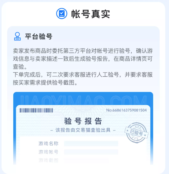 三、账号真实性靠谱。交易猫平台上有特色的官方验号服务,卖家委托客服帮忙验号之后,在账号展示页面会显示一份有官方盖章的穿越火线游戏截图,显示账号内有的资源、角色等级等,买家在确认购买之前还能提出二次验号,保证账号真实性。