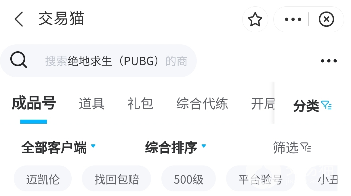 首先如果用户想要进行pubg账号的买号的话,在交易猫可以速的搜索到大量的账号信息,需要简单的搜索框中输入游戏名称,点击2级页面进入游戏账号具体的分区,然后在2级页面的搜索页面中进行筛选,比如说游戏账号段位等等,输入关键词之后便可以看到一系列符合自己要求的账号,然后对这些账号再进行筛选,玩家可以轻松的找到符合要求的账号。