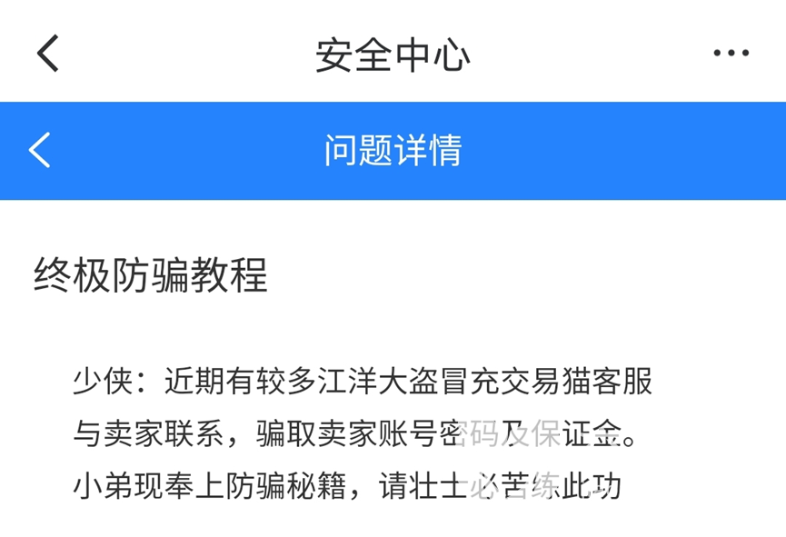 交易猫内有24小时专属客服服务卖家进行账号的售卖,在安全中心里也有贴心的问题专栏,为用户提供回答账号安全相关的问题。