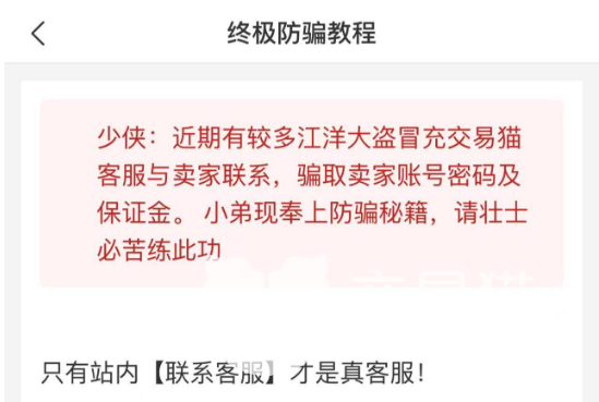 如果是第一次使用平台,在安全方面的意识还不够全面,那么在交易猫里面大家就不用担心了,因为它给小伙伴带来了防骗教程,这个在安全中心也能看到,除了拥有各类线上交易知识的教学外,最重要的是防骗秘籍可以让玩家的交易环境变得更加的安全,大家也要注意,只有在站内联系才能保障是真的客服哦,千万不可想象其他渠道的冒充人员,导致自身利益受损。