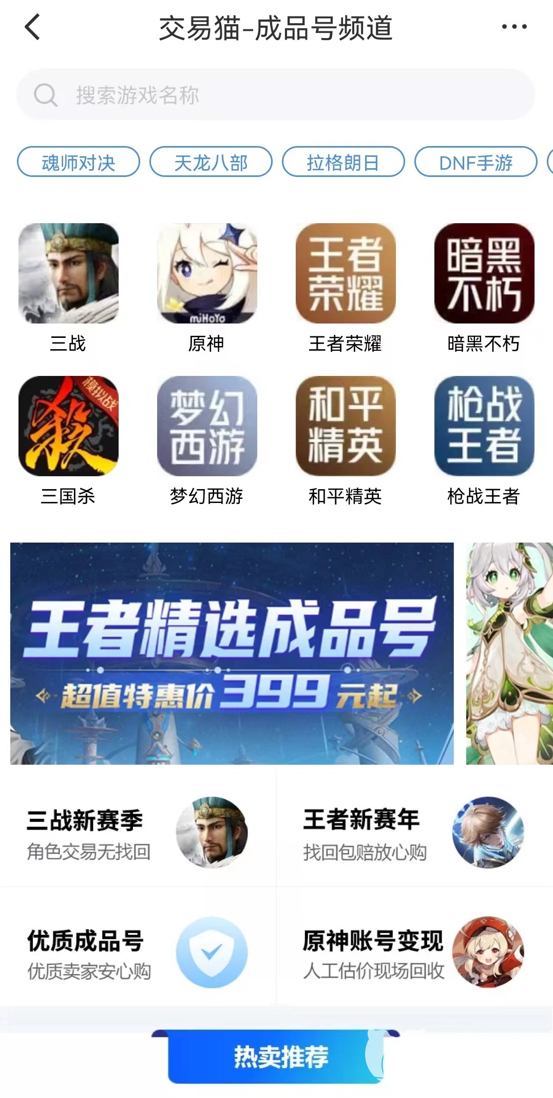 小编向大家推荐交易猫最主要的一点就是这里游戏专区非常丰富,雷霆游戏旗下的各种手游在这里都有专区,例如修仙类的一念逍遥,经营类的奥比岛,动作类的世界弹射物语,还有失落城堡,冰原守卫者,摩尔庄园等一系列知名游戏都可以找到出售的地方。这样玩家就不需要再到处寻找其他平台,这里就能够实现一站式服务,无论有何种需求都可以得到满足。
