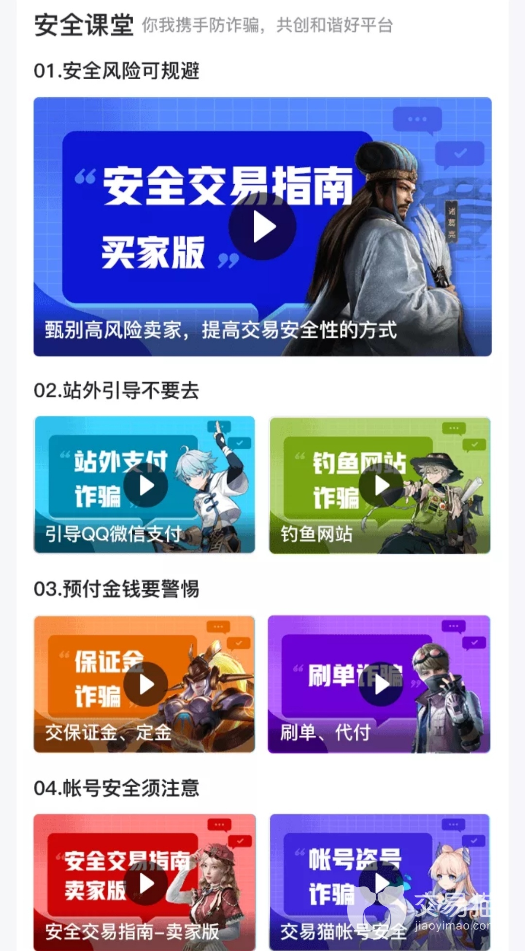 说完了专业性就该轮到玩家们的另一个痛点——安全性了。阿里作为全国最早进军网购市场的大型企业,在管理层面上绝对属于顶级。交易猫在管理上也传承了阿里系的严谨,对于上架的订单进行严格的审核。不仅如此,平台还专门设立了“安全课堂”板块,为“涉世不深”的用户科普防骗小妙招:安全风险可规避、站外引导不要去、预付金钱要警惕、账号安全须注意。以上四大项都贴心地准备了视频来为大家科普,帮助用户快速成为防骗小达人。
