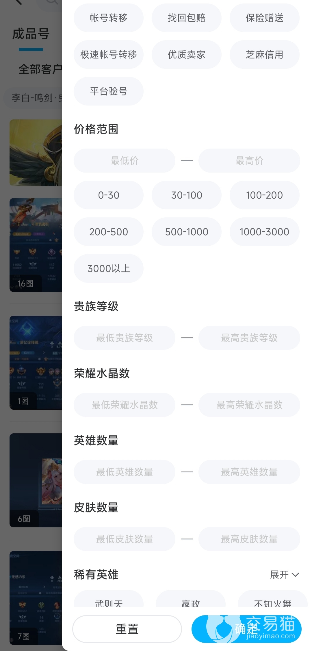 王者荣耀的玩家有很多种,有喜欢收集皮肤的自然也有追求高段位的。不论是时间不充裕亦或是技术有瑕疵,总之会有很多玩家渴望高段位而不得。这时候如果想体验高段位极致的配合和拉扯,买号就是一个非常靠谱的选择。有相当一部分技术过硬的玩家想要通过售卖高段位账号来赚米,但是却苦于没有正规的途径。交易猫很好地为有游戏交易需求的玩家们搭建了一个公平公正的平台,在游戏专区中可以通过精确的筛选来快速找到适合自己的商品,非常便捷。