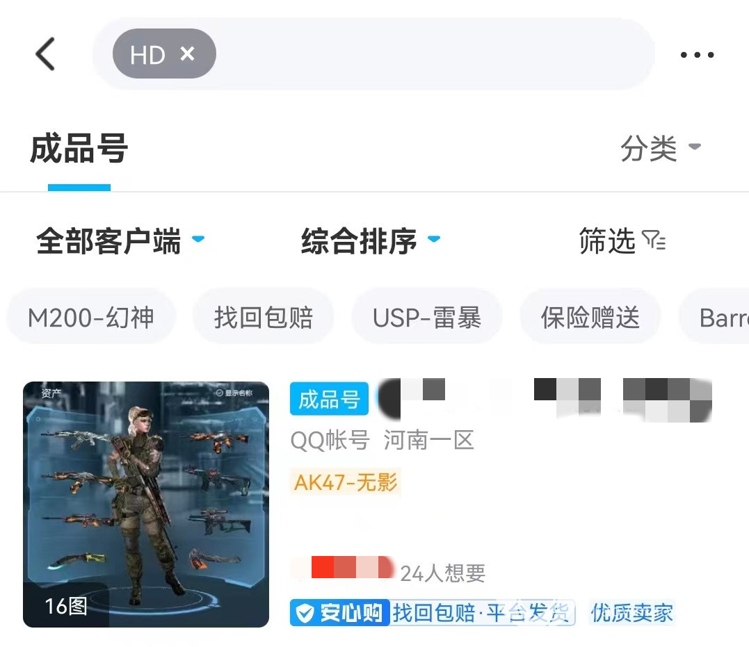要想购买到指定HD区服的账号,大家进入到CF的专区中之后,在上方的商品搜索栏中输入HD,大写小写均可以,然后点击搜索就可以找到需要的内容。并且在账号详情的名称中都已经清楚的标出属于HD区服。当然也可以在这里搜索其他想要的商品非常方便,不仅搜索功能中可以进行选择,还提供了有详细的筛选和分类,可以在已经选择出的商品中再次进行细致筛选。