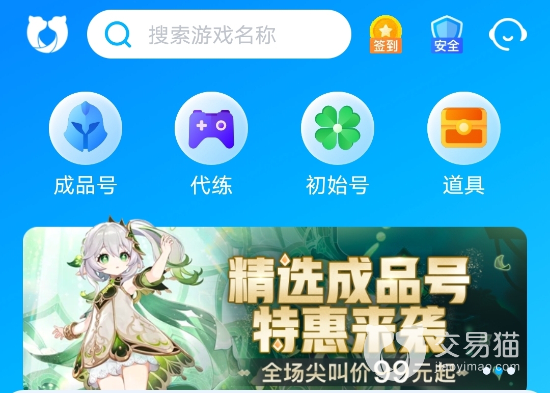 在交易猫的首页会为用户清晰排布出多种账号交易板块,玩家无论是想要进行账号、游戏币、道具交易,还是寻找代练都可以在这款app上实现。