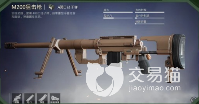 M200狙击枪主要采用的是408口径子弹。因此玩家们如果一旦需要使用M200的情况下一定要多多注意场上是否具有此类子弹。M200自带重型浮置枪管以及脚架因此在远距离射击的情况下,子弹下坠情况表现非常优异,弹道属性也非常的优秀。玩家在有条件的情况下,一定要想办法去争夺一下这款枪的所属权,因为到达游戏后期地图上特种兵越来越少拥有M200可以产生优势发出令人意想不到的威力。