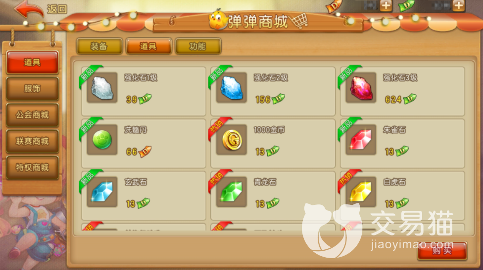 打开商城之后,我们可以看到商城中摆满了琳琅满目的商品。从道具到服饰,到公会商城,到联赛商城以及特权商城,每一个商城内的物品都是不一样的。玩家点击道具就能够看到弹弹商城上还有三个选项,装备,道具及功能,点击道具能够看到一级到三级强化石、洗随丹道具以及玄武石道具,青龙石、白虎石以及朱雀石,还有1000个金币这些都是玩家可以进行购买的。