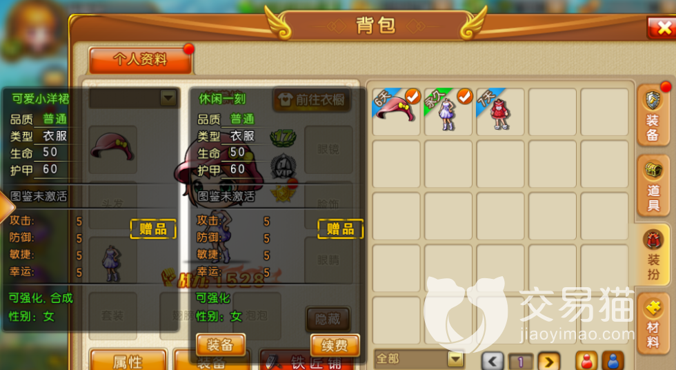 看完道具之后,我们就可以点击商城内的服装按钮,打开就看到商城内出现了非常多玩家可以购买的服装,玩家进行购买穿上会给玩家提供不同的攻击,防御,敏捷,幸运属性。