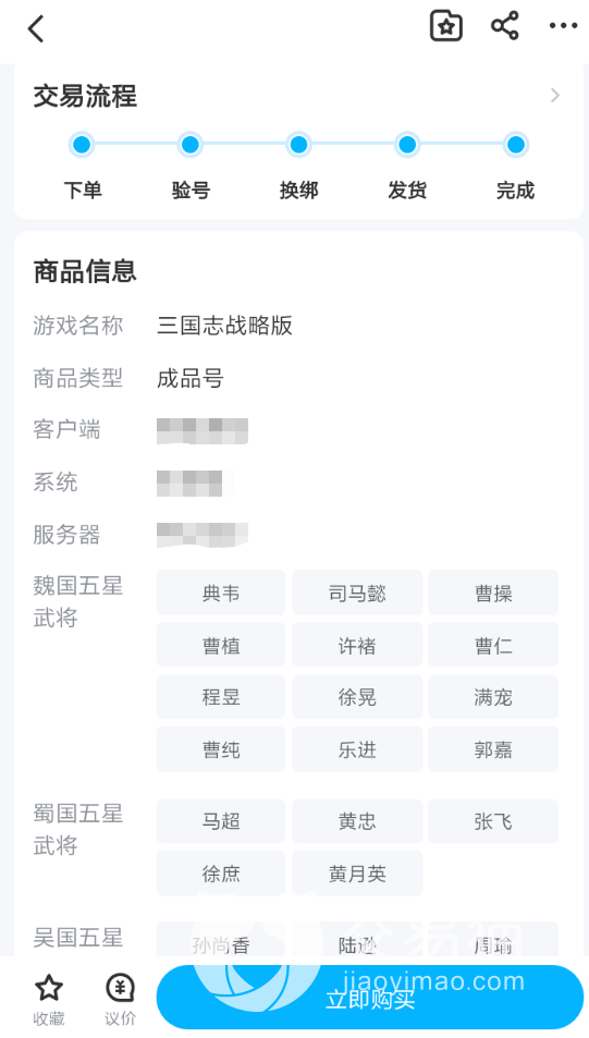 2、详细的交易流程和商品信息,会帮助玩家们更直观的去了解每一个商品。大家在浏览各种游戏号商品的过程成,可以进入到具体内容页面下,获取到当前商品的整个交易流程步骤,同时游戏号中所包含了武将信息也可以从这里进行了解。