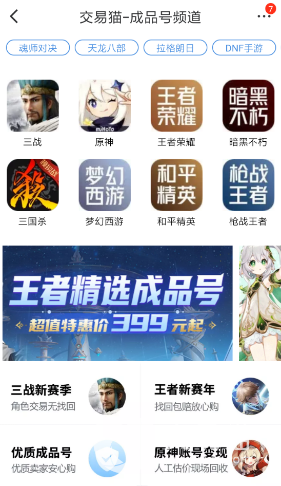 1、在交易猫平台的成品号频道内,首页的热门游戏专区就可以直接看到三国志战略版,大家可以点击这里进入到商品浏览界面。同时,如果还有玩家喜欢的其他游戏专区,大家也可以进入到不同的专区当中,去获取自己喜欢的其他游戏商品。