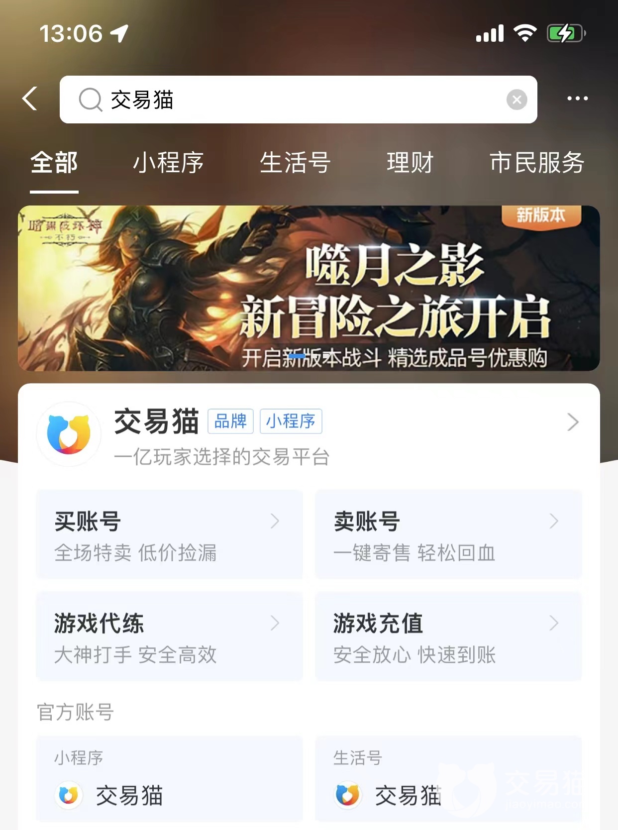 交易猫作为正规的游戏账号交易平台,不仅有着官方的app,在各大应用商店都能下载使用,在支付宝中搜索交易猫也可以立即进入到小程序中,两大官方平台都可以使用,正规的平台可以给用户带来更专业的交易感受。