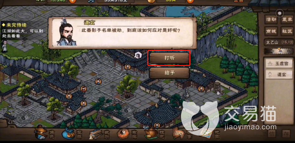 之后像玉虚宫里的NPC道玄进行打听,打听选项里选择“四象奥秘”,之后他就会对你侃侃而谈,不过其中确实会穿插一些关于四象阵的要点,这些需要记一下,因为之后的答题会考到,答题的话,在结束这段对话后,再次找道道玄在对话选项中选择“有所顿悟”即可开始。