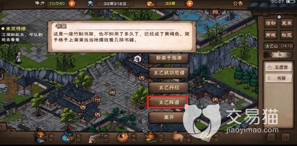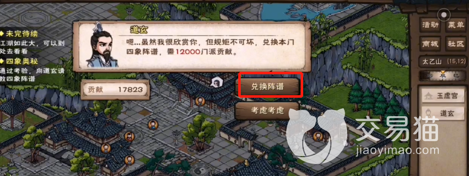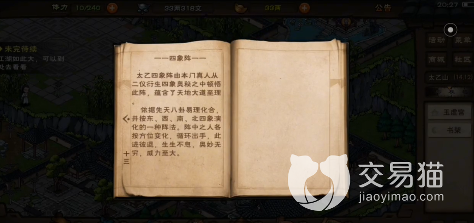 首先需要来到玉虚宫,也就是坐标太乙山(15,12)的位置,然后往上面走一点,看到右边列表里有“书架”选项后直接点击,弹出的选项中找到“太乙阵谱”点进去,随后再对出现的书籍进行翻阅,翻到“四象阵”时退出即可。