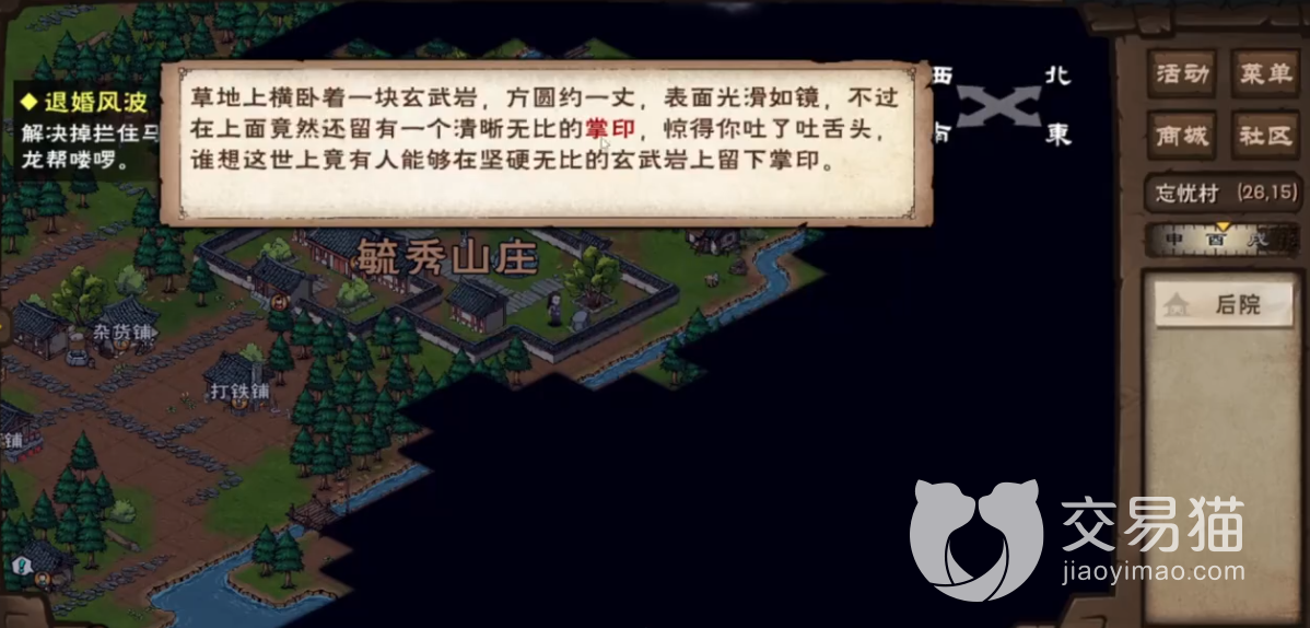 想获得铁砂掌需要严格遵循以下流程,首先来到忘忧村(26,15)的后院进行搜索,搜索一番后会触发特殊剧情,就像上图里显示的那样,玩家会发现一个巨大掌印,这里就算是引出铁砂掌这条剧情线了。