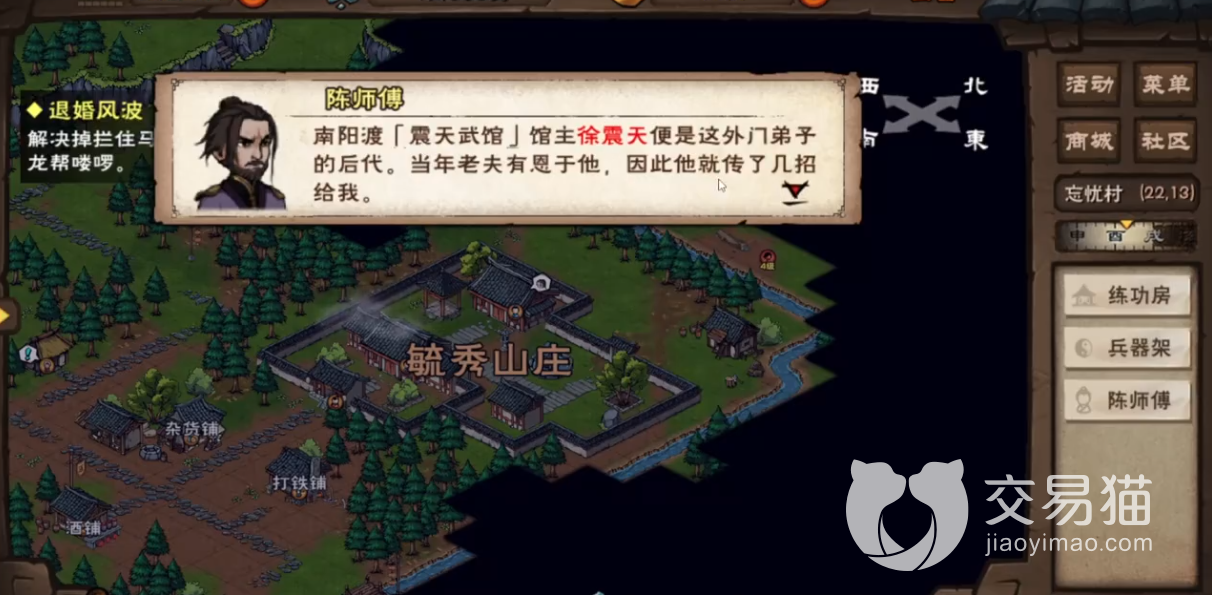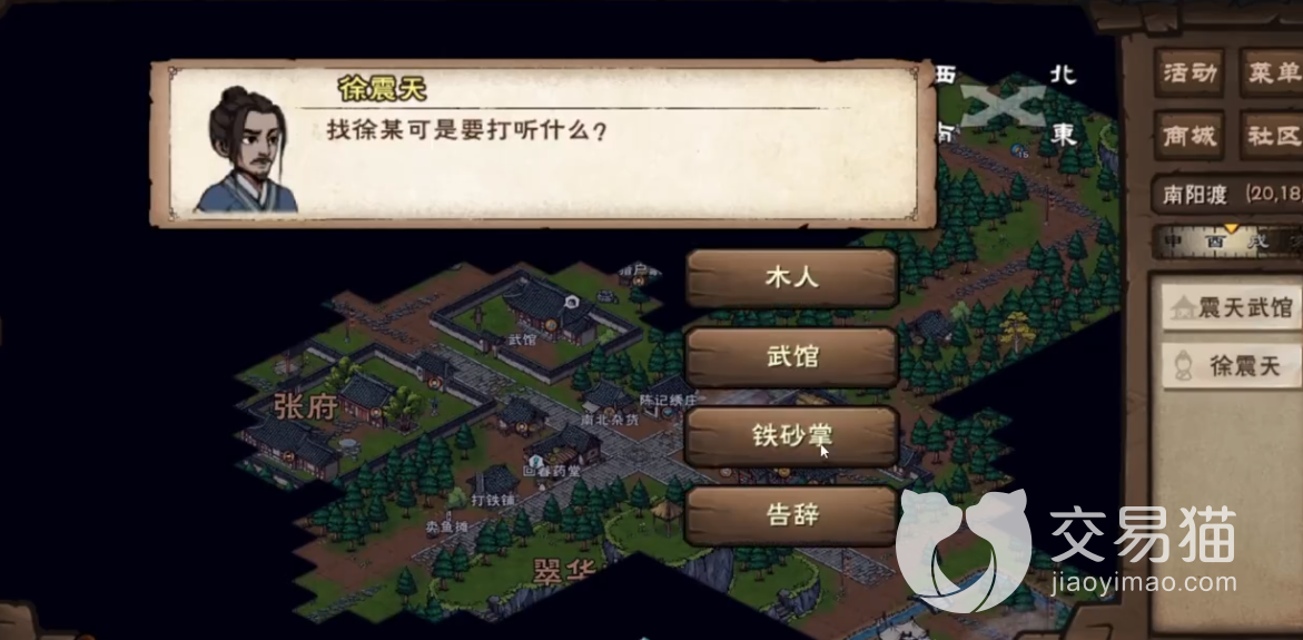 再然后他就会提示你可以去找震天武馆的徐震天学习该武功,其武馆位置在南阳渡,往地图西南方向移动即可到达。