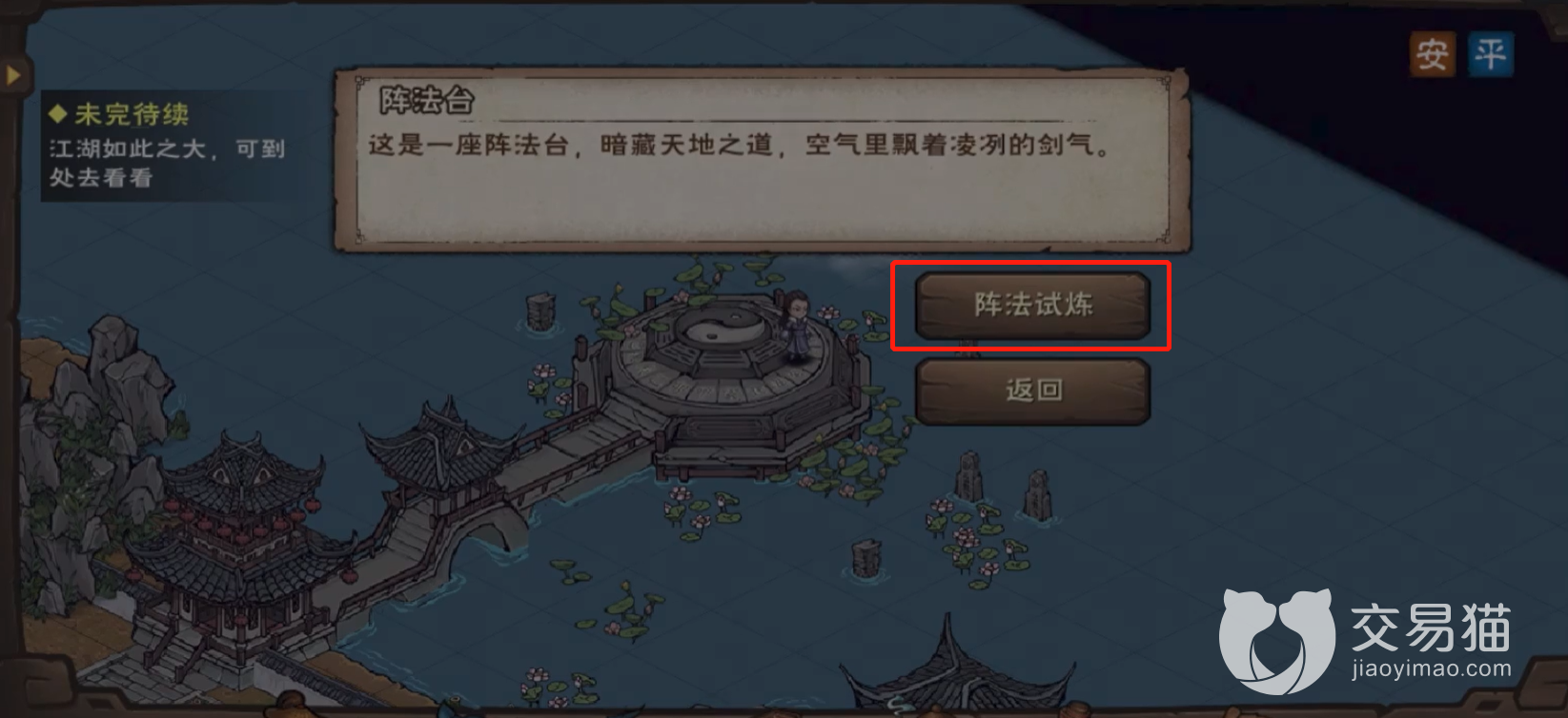 想获得这个功法,首先你得前往聚贤庄的观星台,因为持有该功法的NPC就在那里,观星台被点击之后会出现“启动”,“钓鱼”等四个选项,直接点击启动就好,之后会接着出现子选项,分别是“阵法试炼”和“返回”,这里大家选择前者。