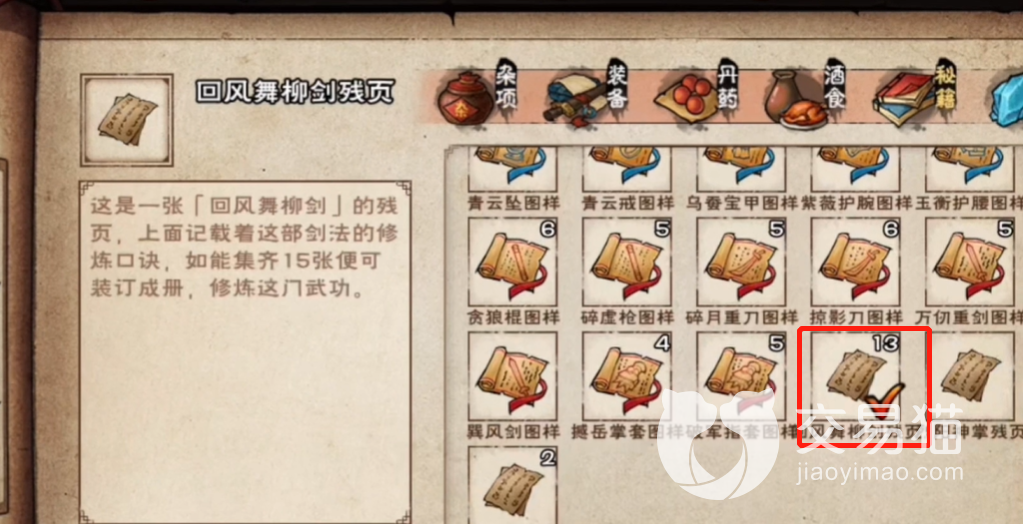 而当你成功击败她后,就可以获得一张回风舞柳剑残页了,残页在背包中可以看见相关的信息介绍,大家可以看到它总共是需要十五张残页才能合成完成功法的,所以换言之,玩家需要参与十五次试炼,并能确保每次都战胜其中的玉面仙子。