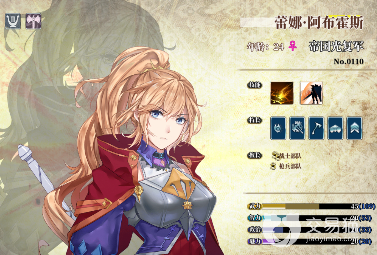 另外,既然都提到了第一宰相,那怎么能不提到皇女蕾娜阿布霍斯呢,顶级的五天赋角色,武力以及智力都是一流水平,两个技能分别可以提升自己的输出,同时还可以减免敌方远程伤害。虽然不算最强,但也有不错的水平。当然,该角色更重要的是她家的天赋技能投资额外增加150%的繁荣度。