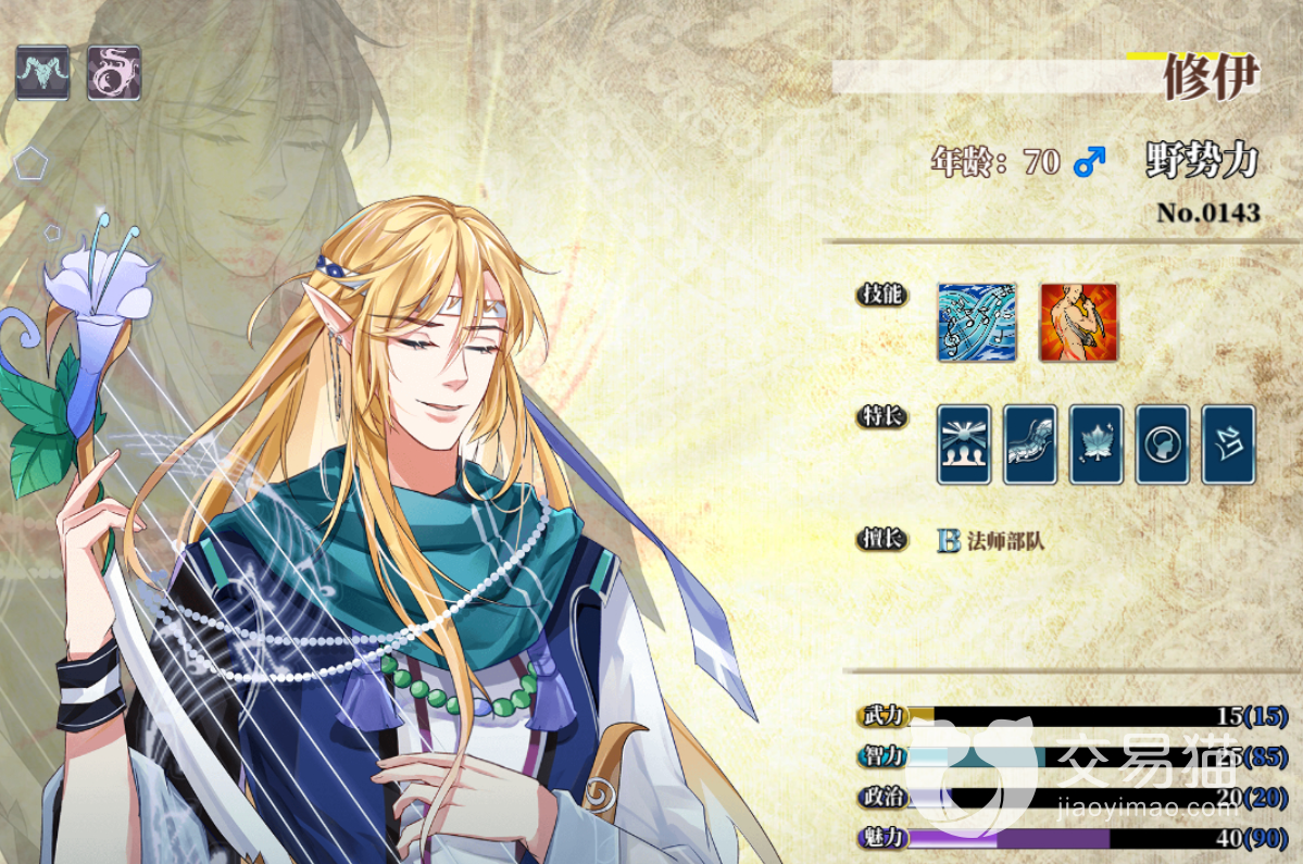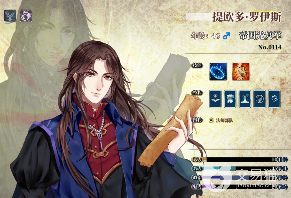 另外,天赋技能方面还附带庆典效果,增加法师攻速、防御,而且有着极高的魅力值,也是目前的在野角色当中魅力单项最高的人物了。做官也可以搞破坏也行,去游说别人也不错,而且有着非常棒的辅助战斗能力,十分的好用。