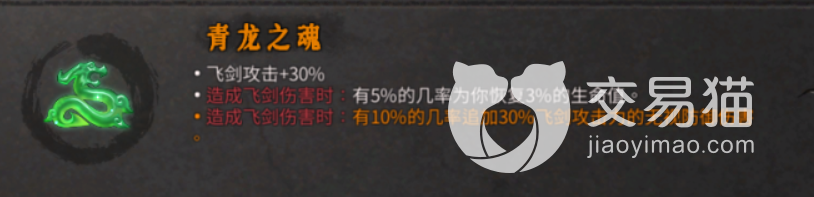 青龙之魂的伤害主要增加的都是飞剑伤害一样拥有四种不同的效果。一号青龙玩家佩戴之后每八秒都能使玩家的飞剑伤害附加上一层闪电的额外真实伤害。二号青龙会给飞剑伤害提高百分之三十并且玩家一旦用飞剑给敌人造成伤害还会给玩家自身恢复百分之三的生命值。三号青龙主要提升玩家的速度只要玩家不停的移动三秒,飞剑的伤害就能提升到原本伤害的百分之一百五。四号青龙的提升数值就非常的靠谱以及接地气,飞剑攻击增加百分之十五,防御增加百分之十二在这里还有个附加的技能就是冷却时间会缩短,因此小伙伴想要发出技能会更快。