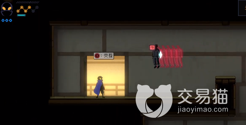 进入桃子城后,有个漂浮的屏幕头人,就说访客,暴力,不,大概意思就是不要使用暴力,暗示了这里是解谜为主的玩法,继续往左走,这时任务会更新猎人黑衣人,进入上面画着浮世绘画风的门,开启解谜玩法,每次进入都有三道门,基本上没有解谜手段的玩家都会在这里卡住。