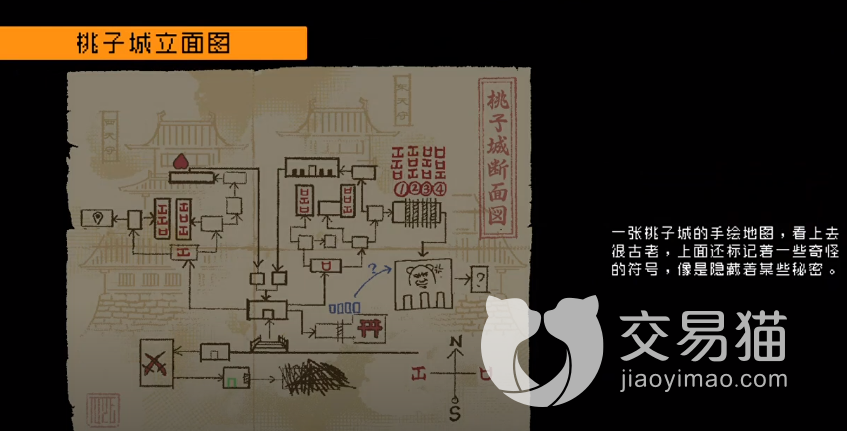这时就要沿着旁边有灯笼的门来走了,一路走到一个有红灯笼的房间,隔着墙壁能看到左边的密闭房间有个道具,在右侧的墙壁处使用蓄力攻击打开隐藏通路,来到左侧取得桃子城的立面图,根据这个上面的符号标识来走门。