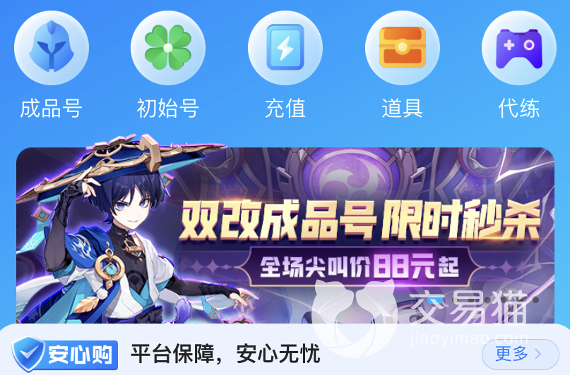 在具体的了解了雷神号的价值之后,玩家们就可以进行上架了,点击主页下方的我要卖,快速填写账号详细信息,一键上传,如果对于买家来说,我们也可以直接在首页搜索原神游戏进入专区,一键定位雷神号,快速购买就可以拥有不同的交易模式,后期玩家也可以在交易猫内选择游戏代练,购买游戏道具等等。