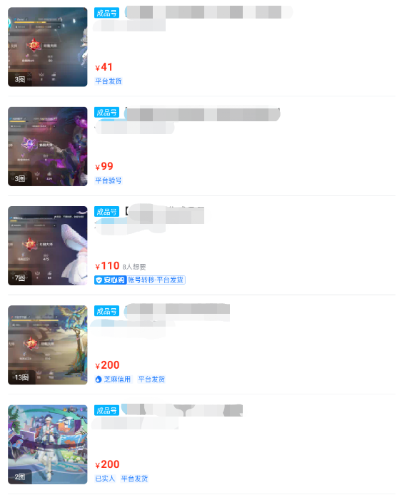 目前这个游戏主要的价值除了英雄和皮肤外,更多还体现在铭文,排位段位,殿堂骑士和玩家的等级上面,其中铭文能提升英雄额外属性,让你在游戏里占据先机,段位和殿堂能让你更有面子,等级则是能解锁更多功能。上述这些条件都满足的话,账号的价值就会得到质的飞跃,以下“交易猫”里的商品列表,顺序按价格升序排列,大家可以看到,仅仅是倒数第三便宜的账号就已经能够卖到三位数。