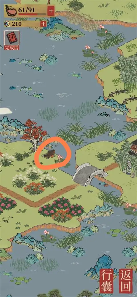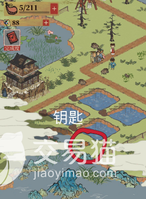 第一把钥匙就在河边四个牡丹花丛的中间,周围除了花丛还有一个可以回复一定探险体力的温泉。