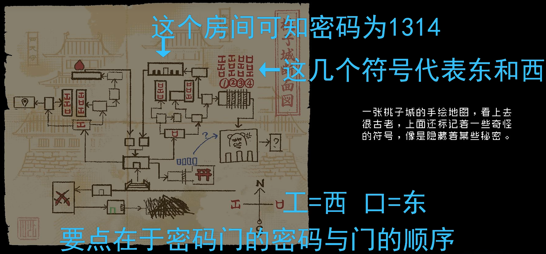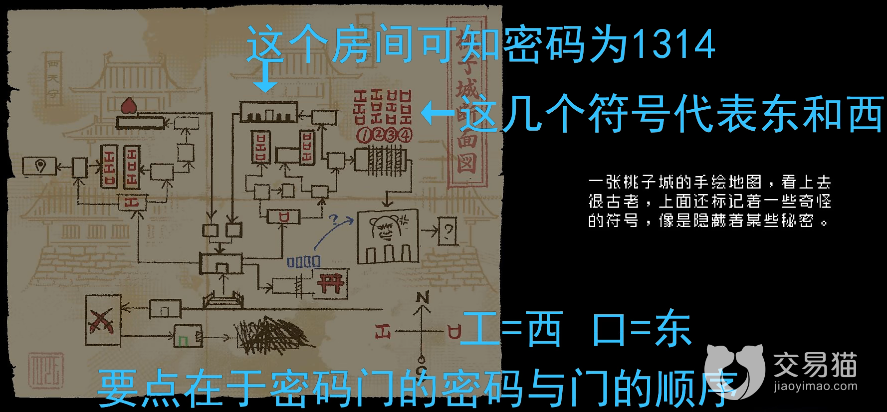 玩家们在想要通关桃子城,地图就十分的重要了,各位小伙伴们在这个地图上可以得到两个解密互动的地点,只需要根据纸条上给出的解密提示,可以很快的就找到相对应的解决方式。