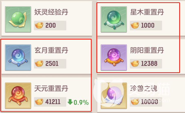 2、需要注意的一点是,三颗阴阳重置丹如果分开卖出去,那么总计价格要比天元重置丹低,因此是不建议大家单独去卖的,最好能留着合成后再卖。如果打算洗技能的话,为了能够节省资源,那么是不推荐直接买天元重置丹的,可以购买阴阳重置丹将其合成为天元重置丹进行使用,这样会更加节约一些。