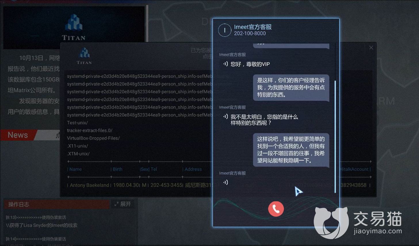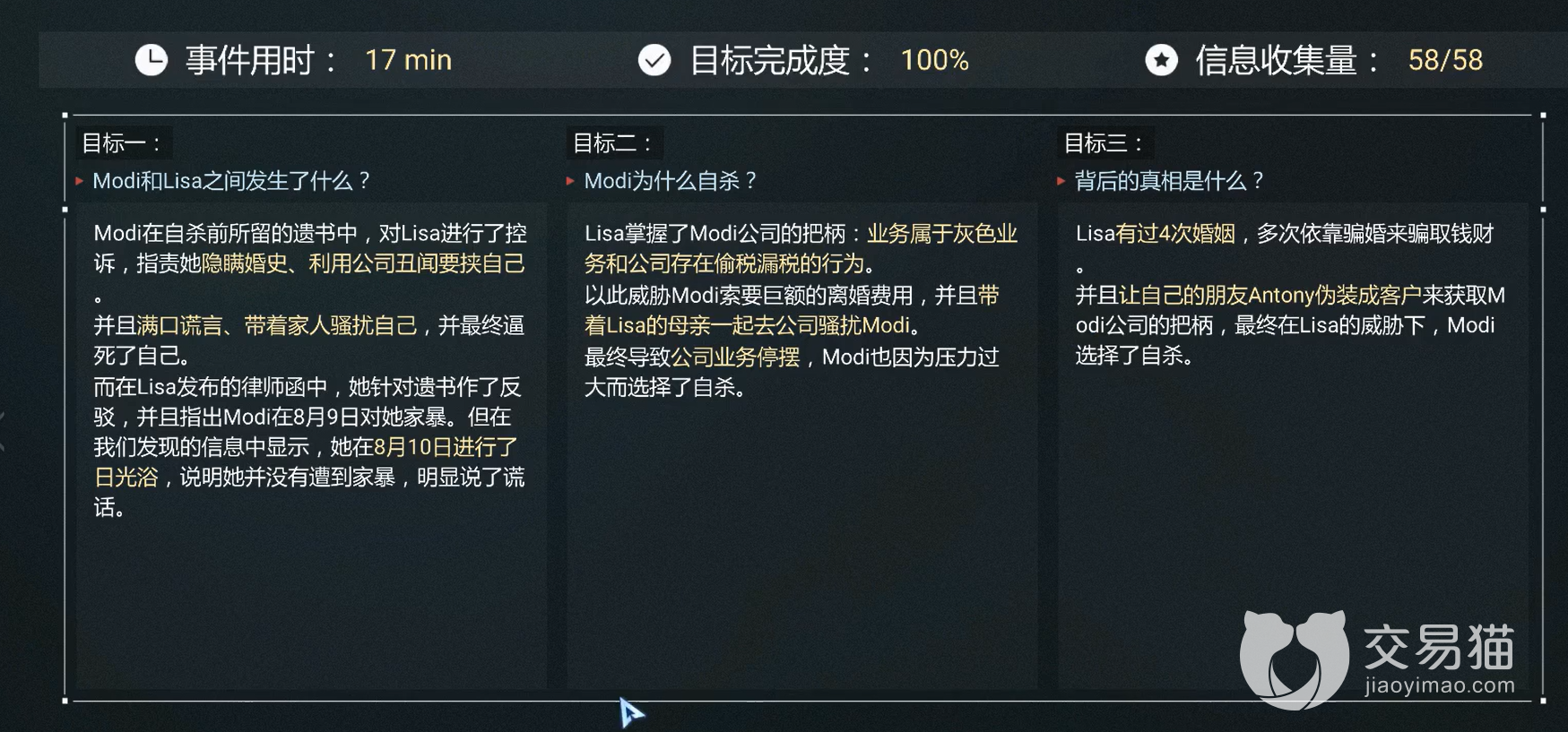 当玩家们到了这一步的时候就可以选择使用匿名电话打给前妻的同学,在该行为中的选择顺序为:实话实说、关于Lisa、关于大学,在玩家们打完电话之后就可以获得信息,然后选择点击右上角进行推理,然后打开数据库选择Modi获得密码【Modi1024】。得到密码之后就可以登录邮箱,然后收集信息,浏览器输入【Daniel Kos】获得大量的线索,浏览器输入【Carter Harris】获得大量的信息,然后再通过推理获得真相。