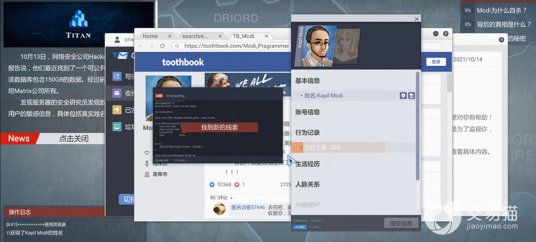 使用浏览器搜索前妻Lisa 的信息,然后玩家通过Toothbook收集到与前妻相关的信息,然后再进入数据库里面,将前期的相关信息输入获得其他的线索,然后在破解中将前妻的名字输入进去之后获得密码【Lisa8849】。然后登陆前妻的邮箱收集信息,使用邮箱找回前妻的book账号,并收集到大量的信息。