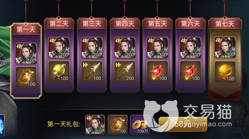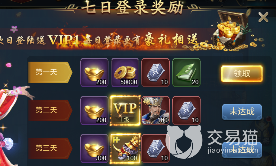 这个算是前七天独有的一个福利,只需要每天登录就能领取,所以大家记得每天上线的时候一定要去点一下主界面左上角的“登录”哦,这里面的奖励还是非常丰厚的,第二天就能领vip,第三天领橙色的宠物,之后更是能领到高级的武将自选箱。